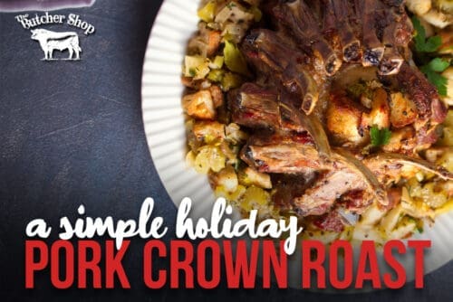 Is there a more festive-looking holiday dish than a pork crown roast? Those beautiful rib bones standing in a tall circle just scream holiday feast. And while it looks impressive sitting on the table, it’s surprisingly easy to prepare. It’s also customizable (just fill the center with stuffing, roasted apples, root vegetables, or your favorite seasonal sides) and can effortlessly feed a crowd. At The Butcher Shop, we prep the crown shape and French the bones for you. All you have to do is season and roast for a simple show-stopping holiday pork crown roast.
